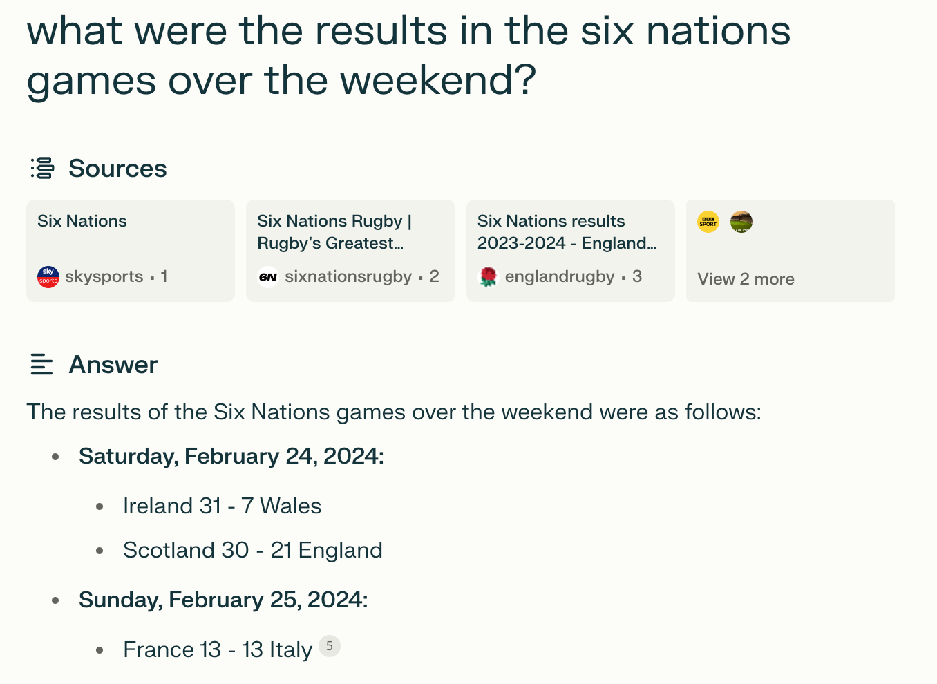 At the start of last week I was using Perplexity and asked it for the results from the weekend’s Six Nations games: