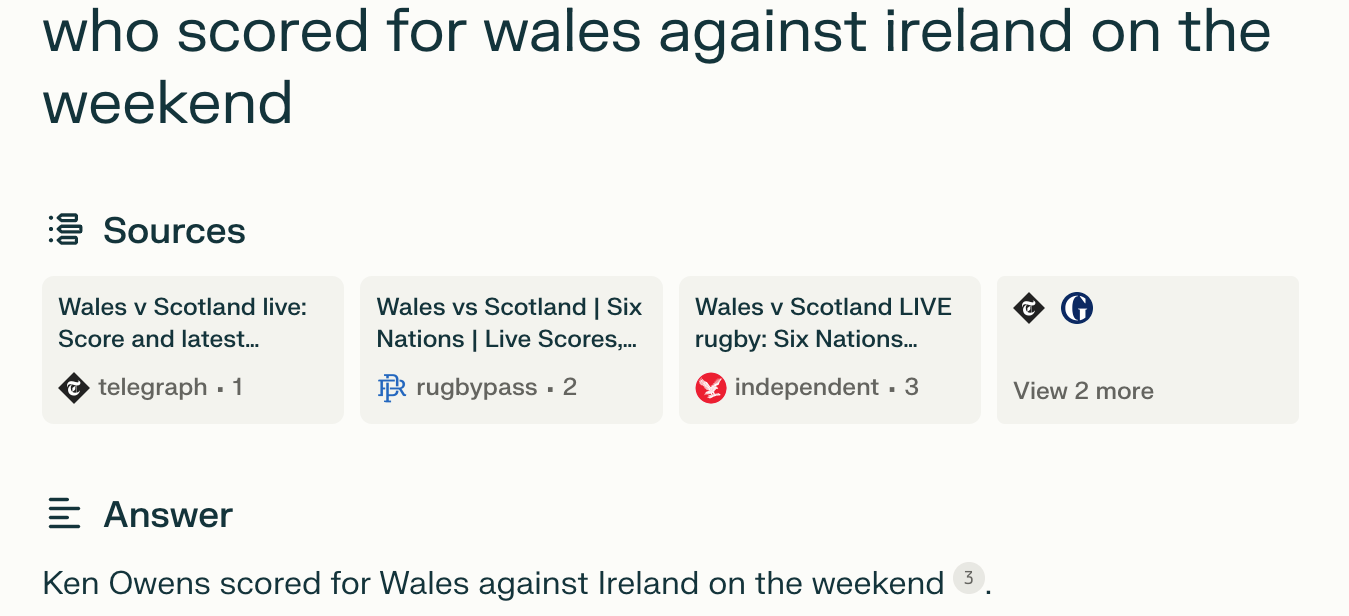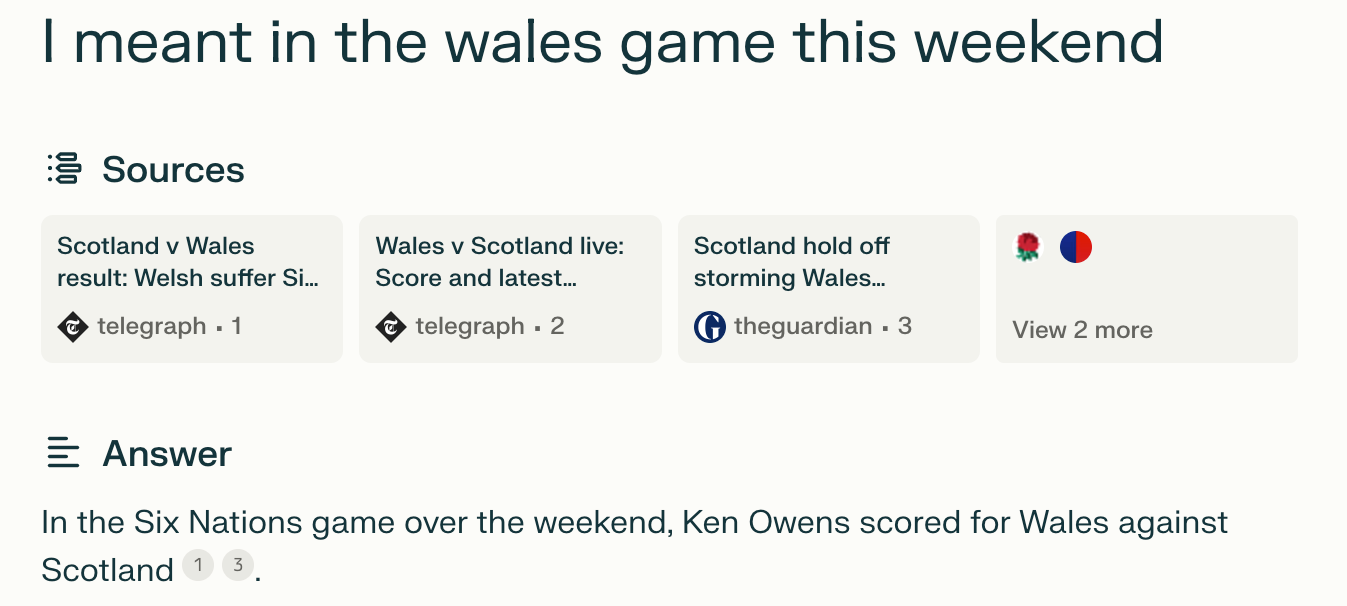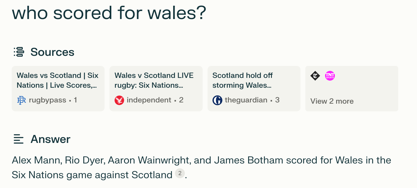 The issue might be with my particular workflow here, of course. It might be struggling because of the conversational nature in which I am approaching it. Having been used to tools like ChatGPT I’ve been trained to just chat to it. If I just treated a bit more like Google maybe it would have yielded better results. But that said, the very last example where I ask the question “who scored for Wales on the weekend against Ireland” Perplexity is clearly still treating in conversationally as it it seems determined to pull in previous context and the 2023 Wales vs Scotland results again to give me the completely wrong answer.